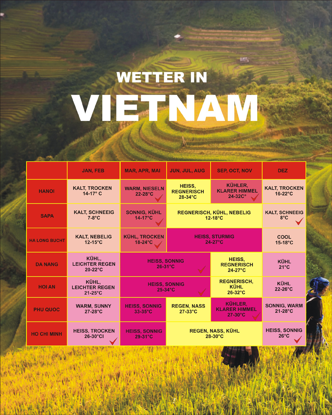 Solch niedrige Temperaturen sind in Vietnam aber eher selten. Vietnam ist ein sonnenverwöhntes Land mit sehr hohen Durchschnittstemperaturen. Vor allem im Süden fällt das Thermometer nur selten unter die 20 °C. Besucher des Landes sollten daher eher darauf achten, dass es in dem Reisegebiet nicht zu heiß ist.
