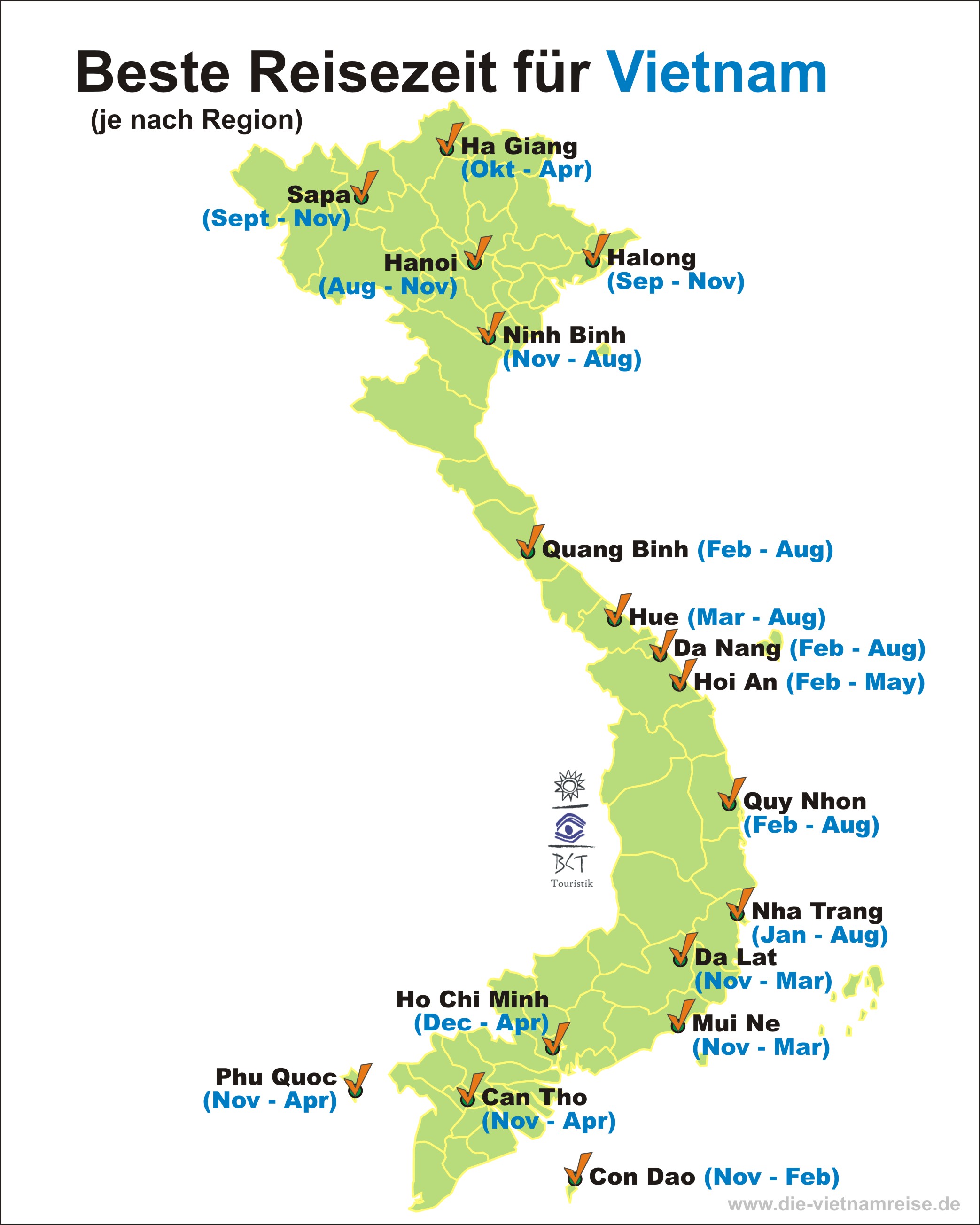 Das Land ist in drei unterschiedliche Klimazonen eingeteilt: Nordvietnam mit Hanoi, Südvietnam mit Saigon und Zentralvietnam mit Da Nang. Das Klima in Nordvietnam ist subtropisch und hat daher warme Sommer und milde Winter, in Zentralvietnam herrscht ein subtropisch-tropisches Übergangsklima mit starken Regenfällen in den Herbstmonaten und in Südvietnam dominiert ein tropisches Klima mit ausgeprägten Regenperioden.