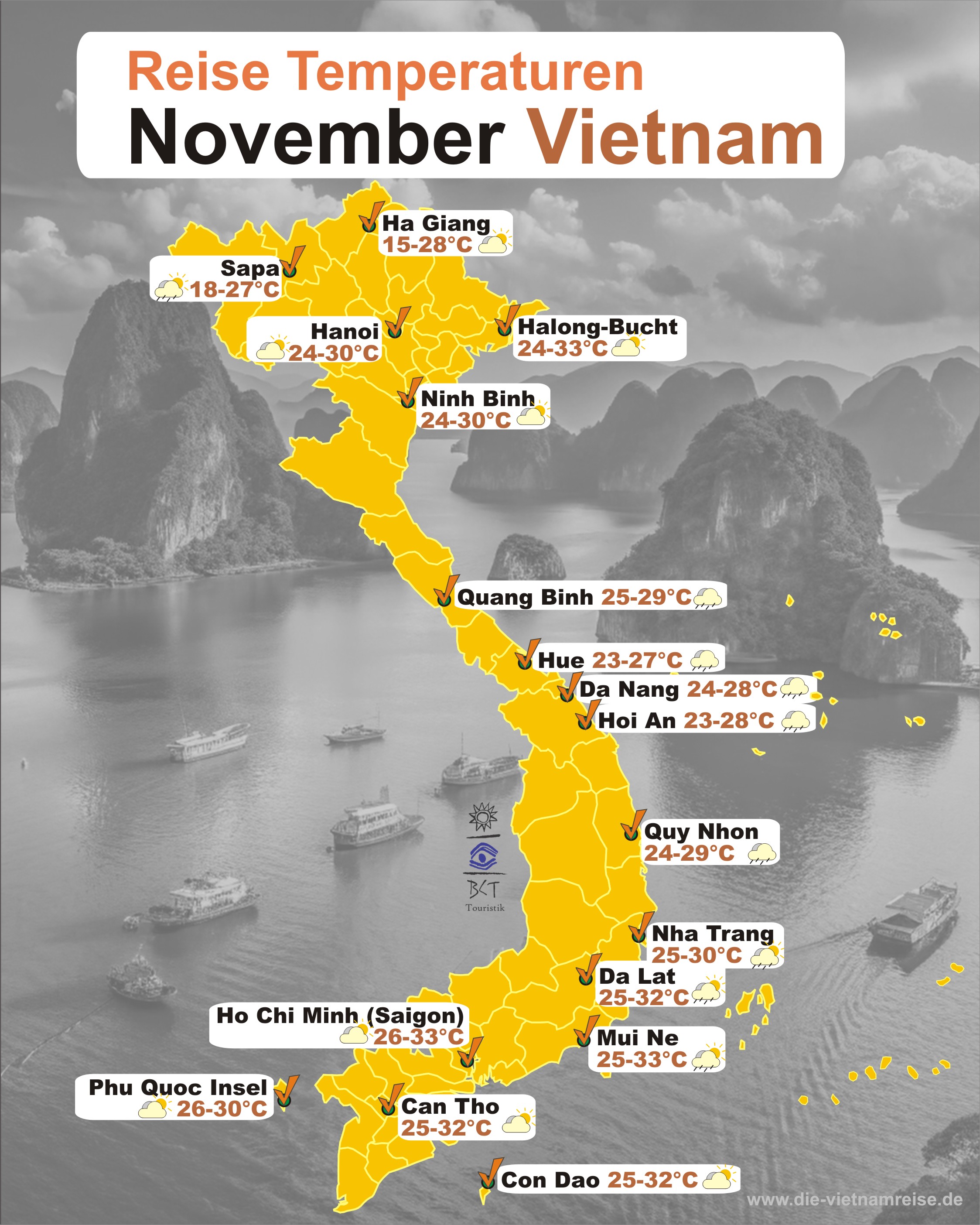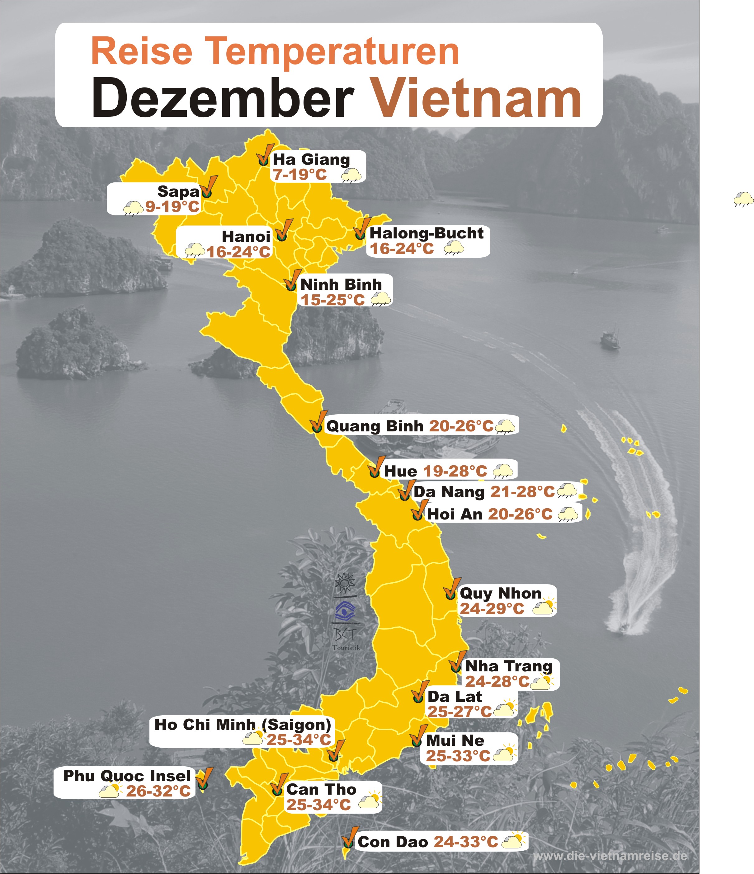 Solch niedrige Temperaturen sind in Vietnam aber eher selten. Vietnam ist ein sonnenverwöhntes Land mit sehr hohen Durchschnittstemperaturen. Vor allem im Süden fällt das Thermometer nur selten unter die 20 °C. Besucher des Landes sollten daher eher darauf achten, dass es in dem Reisegebiet nicht zu heiß ist.